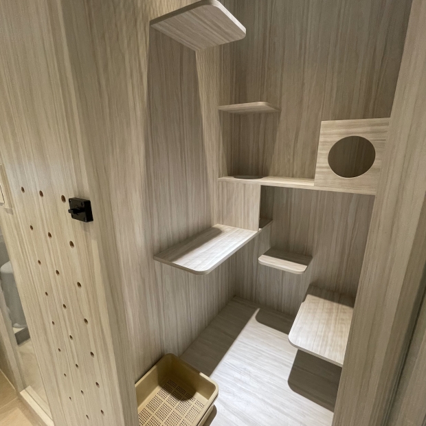多層跳台、躲藏貓窩、觀景泡泡、通風設備、二個插座、24小時攝影機、開放型貓砂盆、貓砂(礦砂、豆腐砂、松木砂擇一)、陶瓷餐碗、實木貓碗架、寵物飲水機(全新濾心+$80)