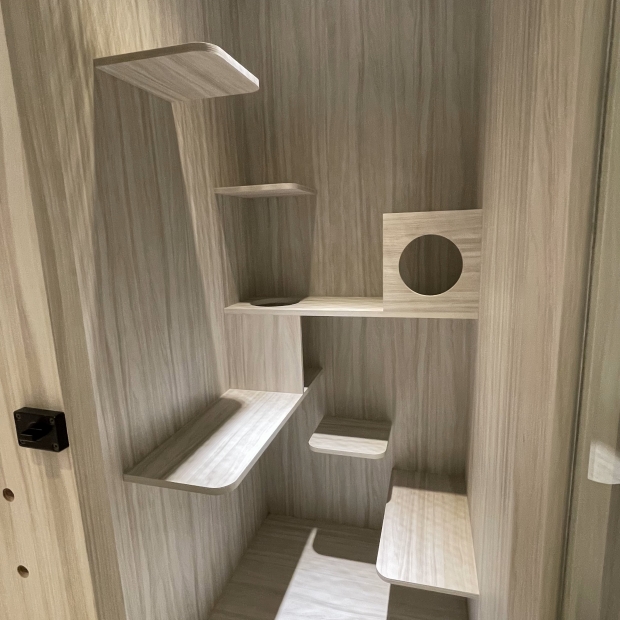 順應貓咪喜愛跳高的天性,除了多層貓跳台與躲藏貓窩,還有閣樓觀景泡泡可以登高俯視環境,滿足貓咪的安全感與好奇心。